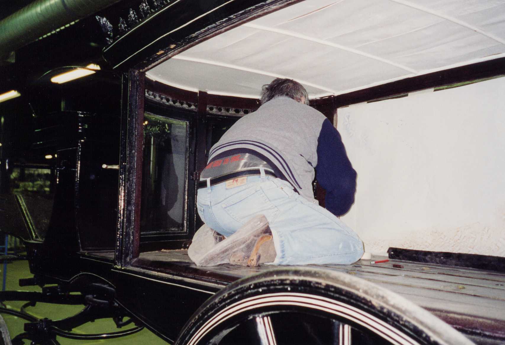 Brilliant cut and acid etched window in a horse draw coffin carrier