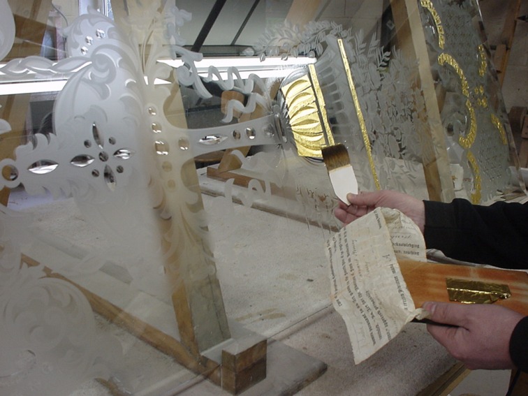 Gold leafing to Brilliant cut, acid panel before silvering