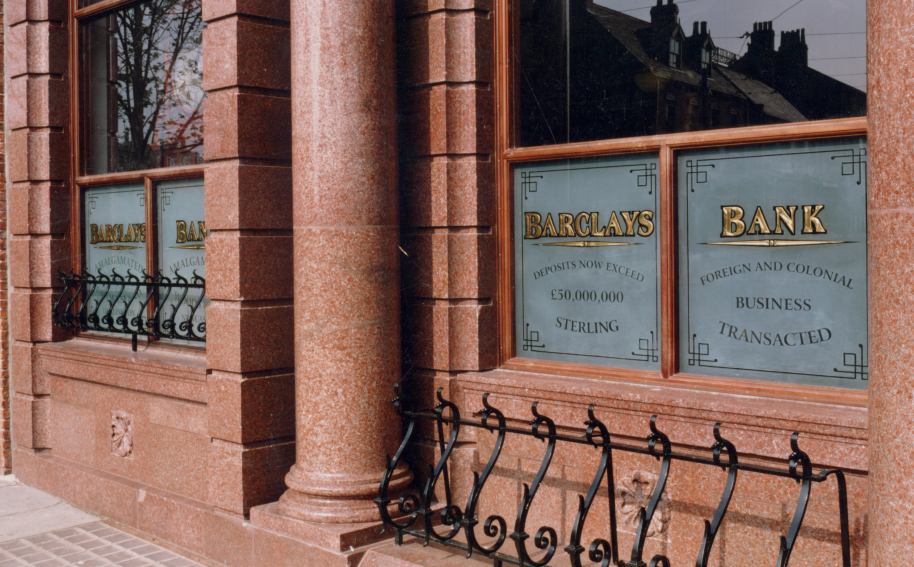 Brilliant cut, acid etched, gold leaf bank windows.