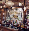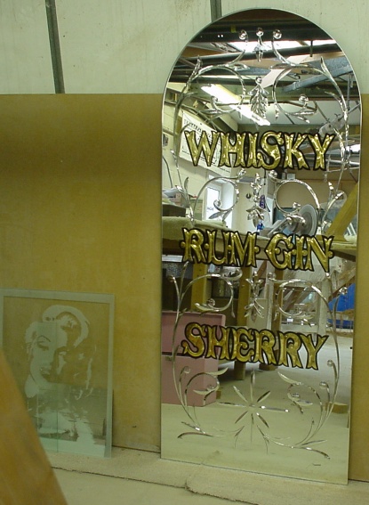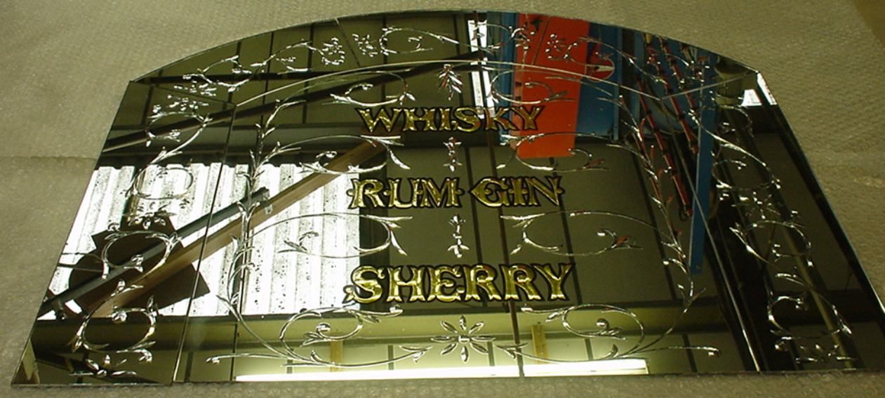 Brilliant cut, acid etched, painted and gold leaf back bar mirror