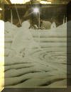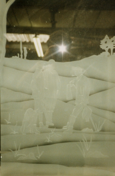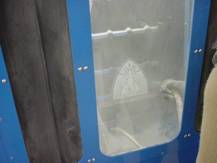 A misnomer really, as you can not use sand as a blasting agent. It does you real and permanent harm. Other less harmful grits are used, different size grits leave a rough or smooth surface to the glass, this difference can be used in the design. Again this is not the definitive guide to sandblasting.