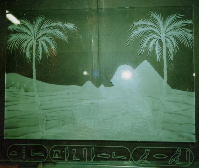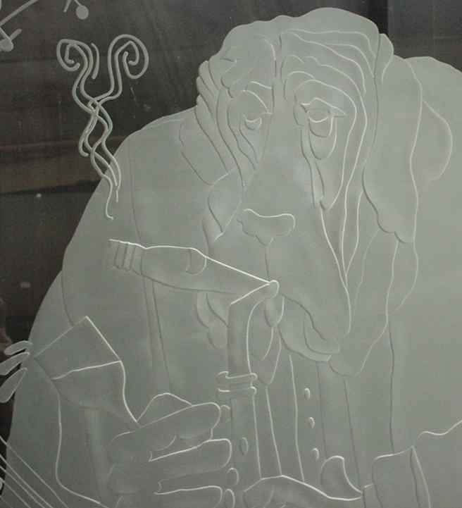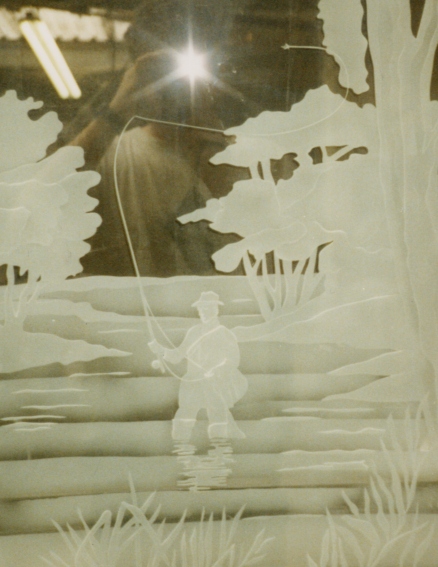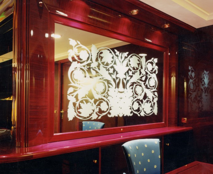 Again a design is prepared and applied to the glass using computer and cutter as previous discussed.